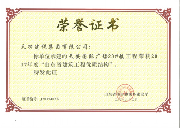 2017年度山东省建筑工程优质结构-尊龙凯时人生就搏建设集团有限公司官网