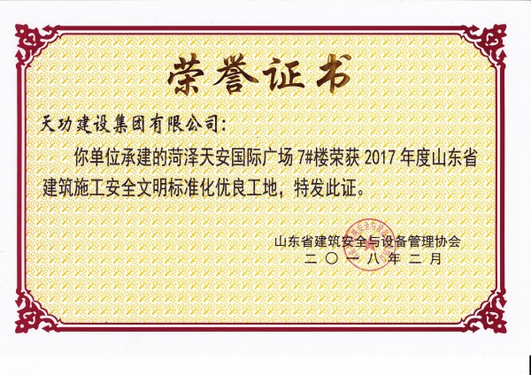 2017年度省建筑施工安全文明标准化优良工地-尊龙凯时人生就搏建设集团有限公司官网