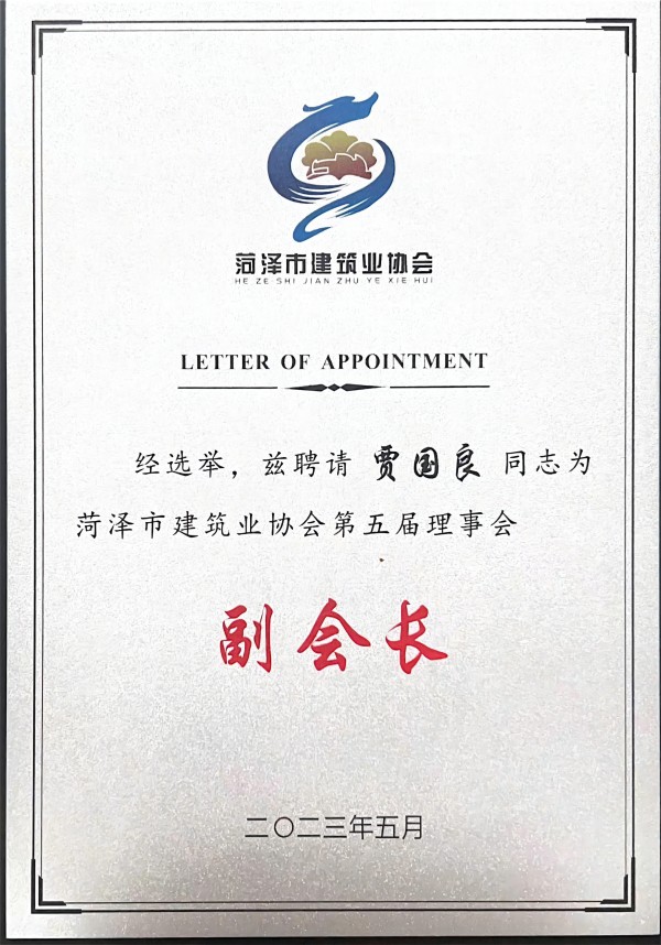 热烈祝贺贾国良同志被菏泽市建筑业协会聘为第五届理事会副会长