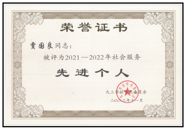 热烈祝贺贾国良同志被九三学社中央委员会评为先进个人